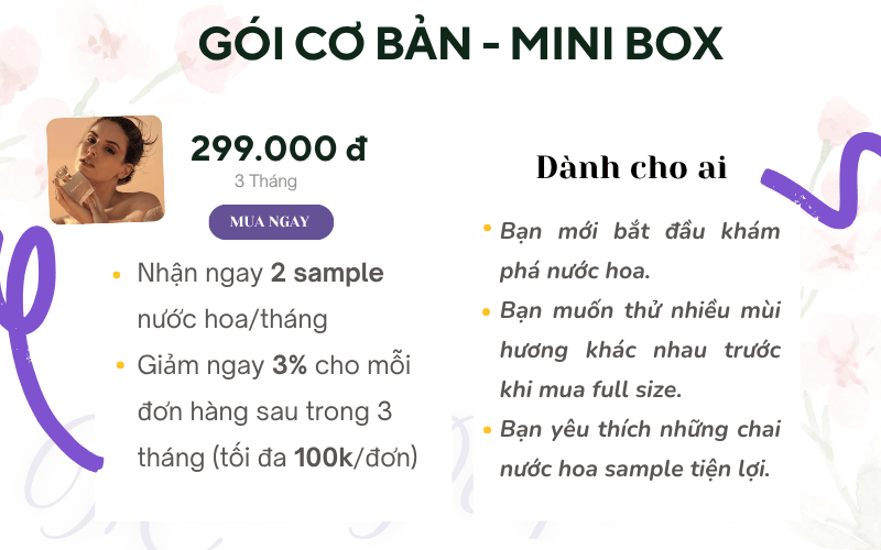 Với chương trình “Thành viên độc quyền”, bạn sẽ được nhận những mẫu nước hoa cao cấp mỗi tháng, khám phá những mùi hương HOT nhất từ các thương hiệu danh tiếng mà không cần lo lắng về giá cả. Chỉ cần đăng ký một trong 3 gói ưu đãi dưới đây, mỗi tháng Missi Perfume sẽ gửi đến bạn những trải nghiệm hương thơm đầy mê hoặc!
