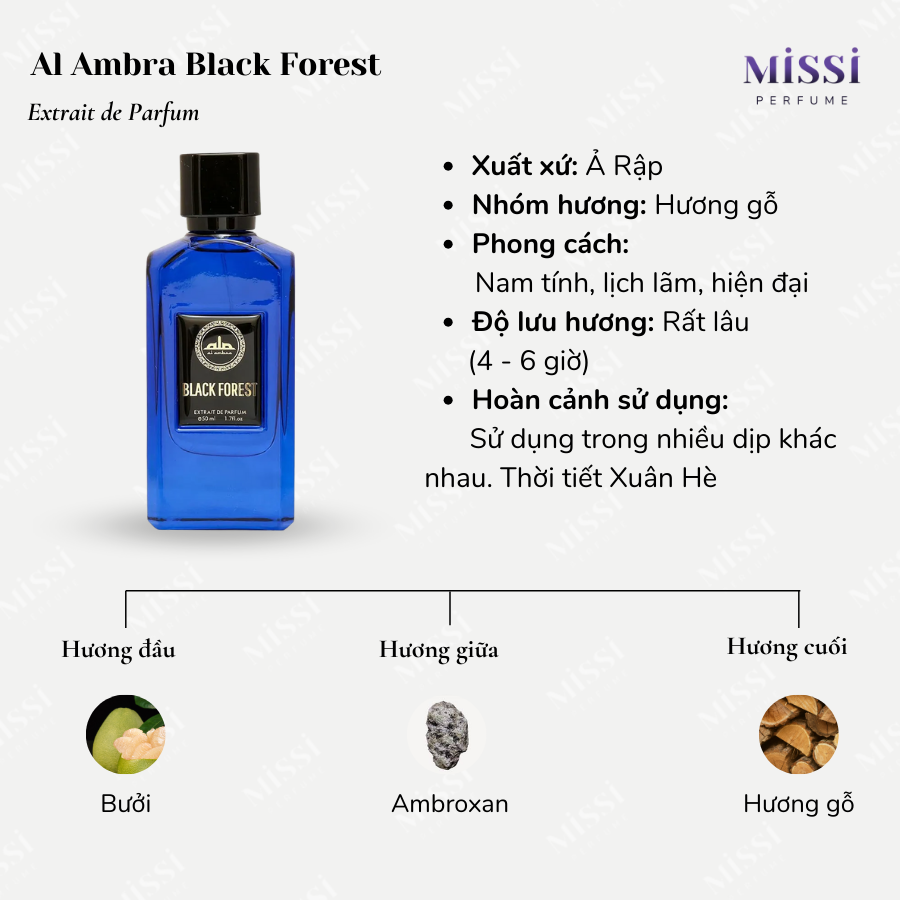 Với sự kết hợp của bưởi, Ambroxan và hương gỗ, Al Ambra Black Forest Extrait De Parfum tạo nên tông mùi dày, khói, ngọt nhẹ đầy cuốn hút. Em này cũng là chai nước hoa dễ dùng, thích hợp sử dụng trong thời tiết Xuân Hè.