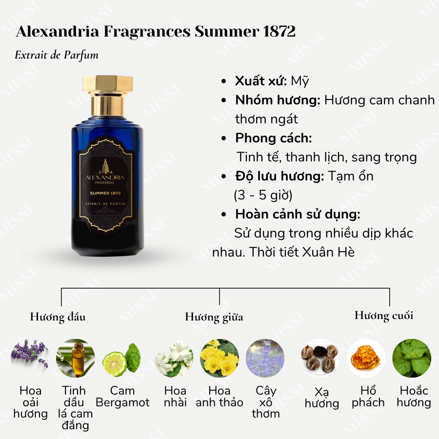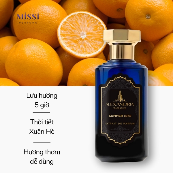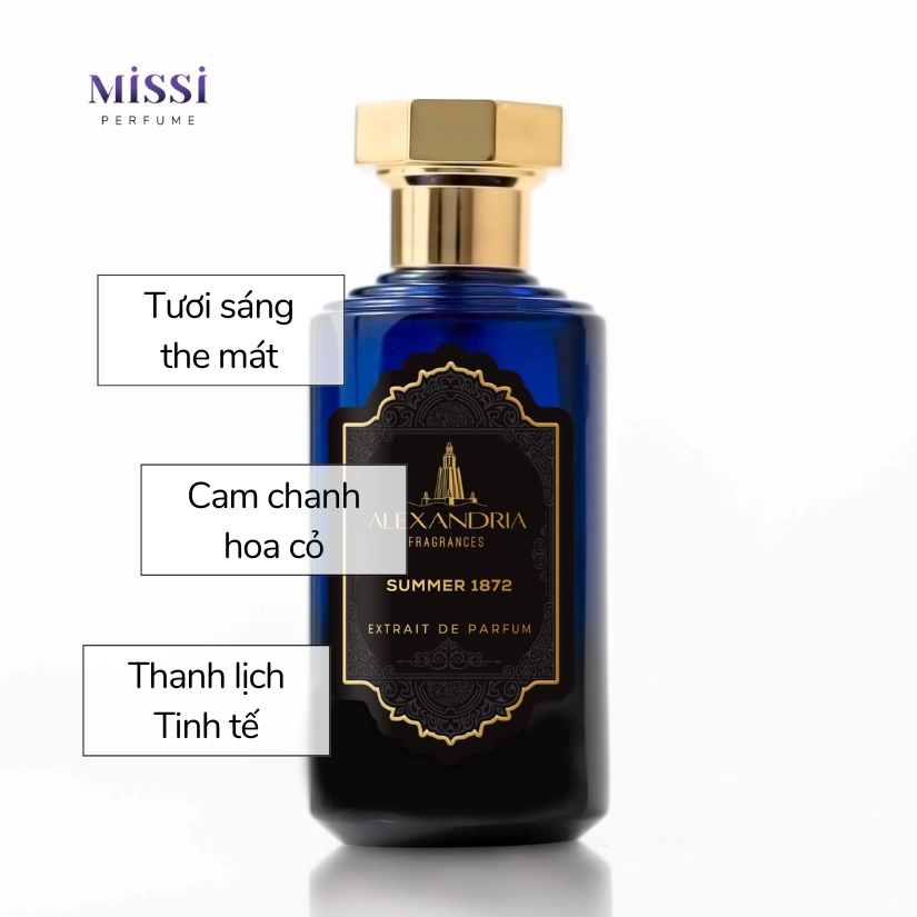 Alexandria Fragrances Summer 1872 Extrait de Parfum là mùi hương tươi sáng, the mát từ cam chanh – hoa cỏ. Với tông mùi dễ chịu, thoải mái, Summer 1872 chính là lựa chọn lý tưởng cho những ngày  Xuân Hè oi ả.