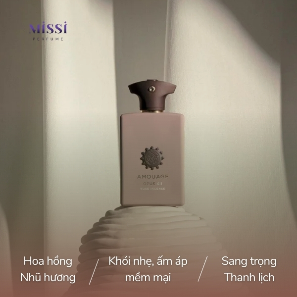 Cụ thể, Amouage Opus XII Rose Incense mở đầu chuỗi hương bằng một làn khói nhẹ đến từ nhũ hương xen lẫn với cảm giác tối, xanh tươi nhưng có cảm giác hơi lạnh đến từ nốt mùi mực và nhựa Elemi. Dần dần, nốt hương của hoa hồng Damask hiện lên rõ hơn. Hương thơm hoa hồng trong em này không đi theo xu hướng ngọt ngào, mềm mỏng mà là nốt mùi hoa hồng đậm, có cảm giác bột bột và được bao quanh bởi làn khói nhẹ nhàng của nhũ hương. Cuối cùng, hương thơm khép lại trong cảm giác êm ái, mịn màng của nhựa Myrrh, gỗ đàn hương, Vanilla và gỗ tuyết tùng.