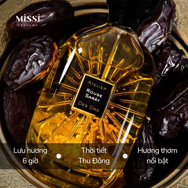 Cụ thể, Atelier Des Ors Rouge Saray EDP mở đầu chuỗi hương bằng nốt mùi chua chua ngọt ngọt của mận và cay nhẹ từ quế. Nốt mùi hoa nhài ở tầng hương đầu không quá rõ ràng mà chỉ thoang thoảng mùi hoa nhẹ nhàng. Nối tiếp là tầng hương giữa với hương thơm ngọt ngào nổi bật từ chà là và hoa vòi voi xen lẫn với cảm giác đất, ấm áp từ hoắc hương. Cuối cùng, hương thơm khép lại trong cảm giác kem mịn, ấm áp từ Vanilla, nhựa thơm Peru, gỗ Guaiac và gỗ đàn hương.