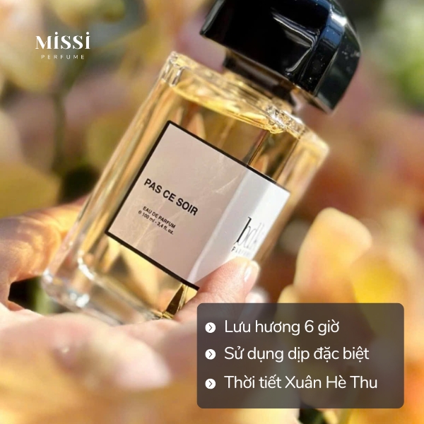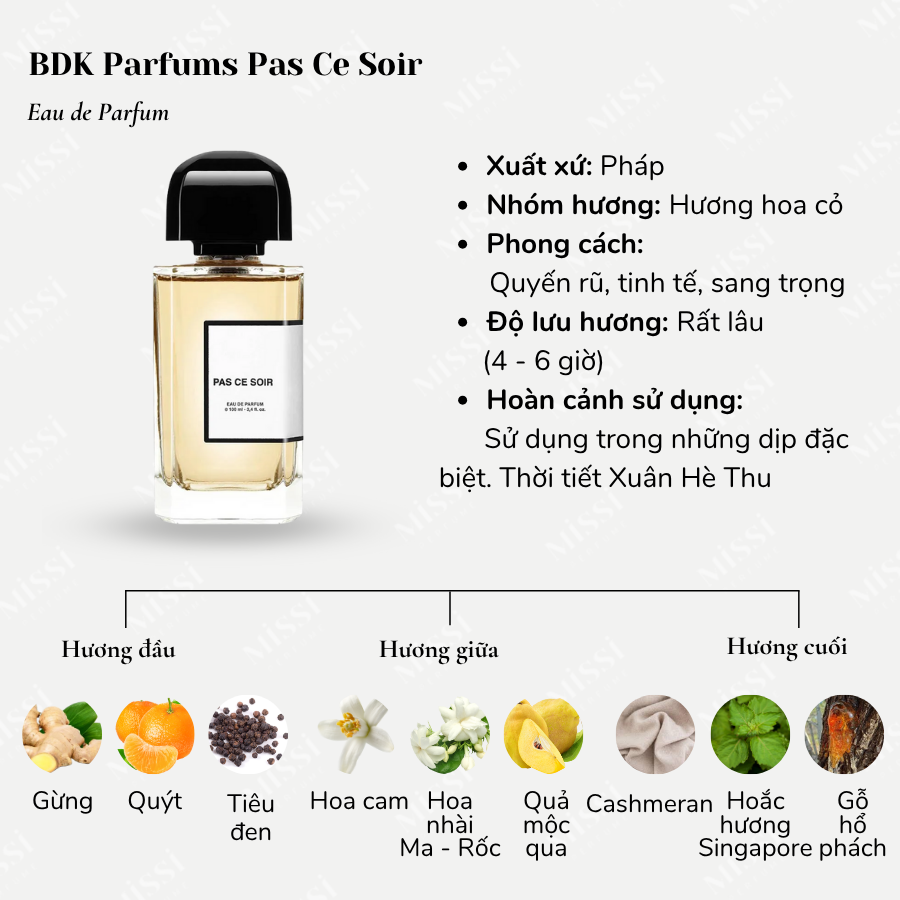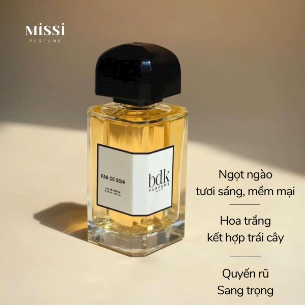 BDK Parfums Pas Ce Soir là sự kết hợp giữa trái cây và hoa trắng, được tinh chế hài hòa và khéo léo. Mang đến cho người dùng tông mùi ngọt ngào, mềm mại và tươi sáng đầy lôi cuốn.
