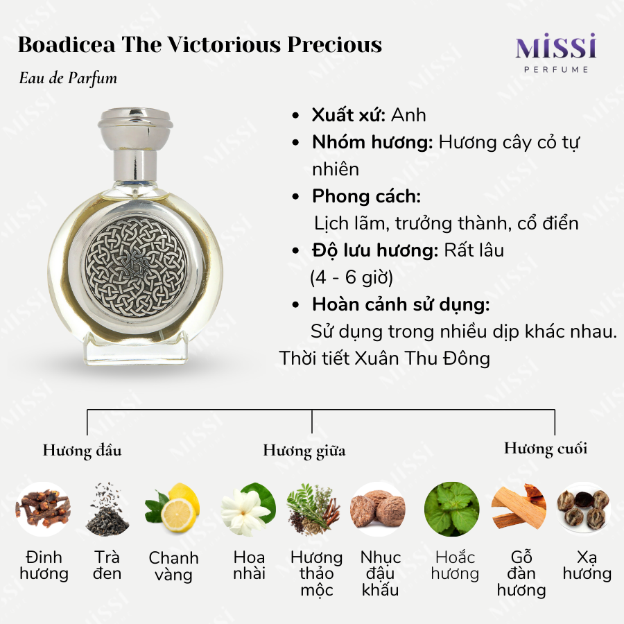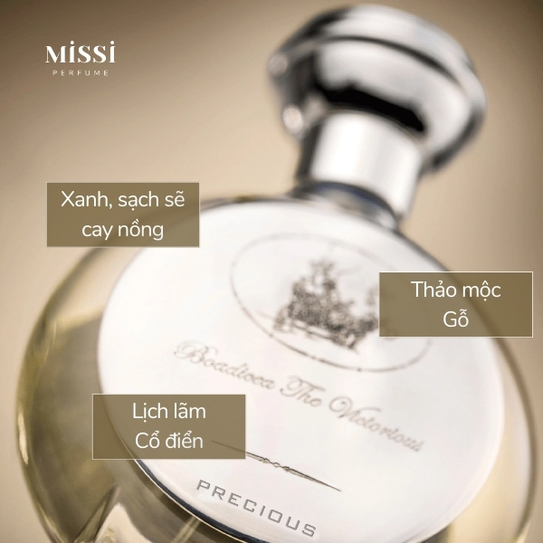 Boadicea The Victorious Precious là mùi hương theo hướng thảo mộc – gỗ, chủ đạo là nét mùi xanh, cay nồng, sạch sẽ. Em này đặc biệt phù hợp với những quý ông từ khoảng 26 tuổi trở lên có phong cách trưởng thành, lịch lãm.