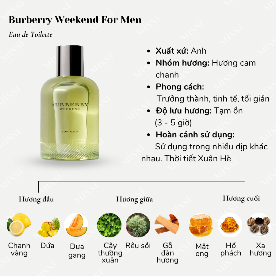 Burberry Weekend For Men EDT mở đầu bằng hương thơm tươi mát, chua và có phần gắt nhẹ từ chanh vàng, bưởi, cam Bergamot và quýt. Hương thơm sẽ nhanh chóng được làm dịu đi với tông mùi ngọt trái cây đến từ dứa và dưa gang. Sau khoảng 10 phút, Weekend For Men sẽ chuyển sang tông mùi xanh mát, khô và cay nhẹ của cây thường xuân, rêu sồi và gỗ đàn hương. Sự xuất hiện của mật ong, xạ hương và hổ phách ở cuối giúp cho mùi hương có thêm vị ngọt dịu, cân bằng với nét chua sắc lúc đầu.