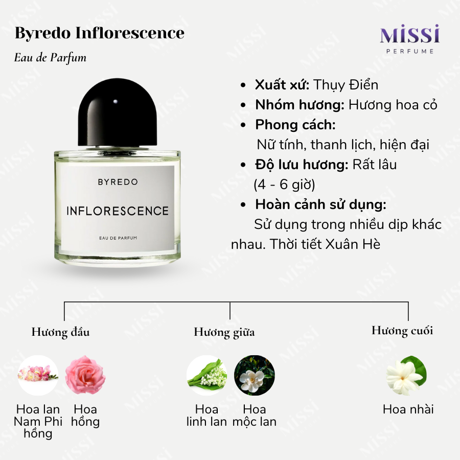 Với tổ hợp từ nhiều loại hoa khác nhau, Byredo Inflorescence mang đến cho nàng tông mùi hoa cỏ xanh tươi, thanh dịu và đầy sức sống. Mặc dù thành phần với rất nhiều loại hoa nhưng hương thơm của Inflorescence được tinh chế vừa phải, dễ chịu và không gây cảm giác nồng gắt đau đầu. Do đó, nếu nàng là tín đồ của nước hoa tông mùi hoa cỏ sẽ không thể bỏ lỡ Byredo Inflorescence.