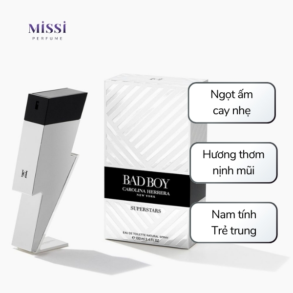Nếu bạn đang tìm kiếm mùi hương ấn tượng, dễ dùng và có thiết kế ấn tượng để trưng bày trong bộ sưu tập của mình thì hoàn toàn có thể tham khảo qua Carolina Herrera Bad Boy Superstars. Em này sở hữu thiết kế hình tia sét bạc vô cùng bóng bẩy, mang đến hiệu ứng như một tấm gương phản chiếu. Về phần mùi hương, Carolina Herrera Bad Boy Superstars vẫn giữ được DNA của phiên bản gốc nhưng có phần trẻ trung và nịnh mũi hơn.
