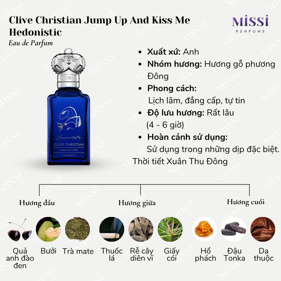 Clive Christian Jump Up And Kiss Me Hedonistic mở đầu bằng nét mùi nồng nàn, tối của quả anh đào đen, chút chát nhẹ và đắng từ trà mate và tông mùi trái cây chua nhẹ, mọng nước của quýt, bưởi, chanh vàng, cam Bergamot, lá hoa Violet, xô thơm và hoa cam. Dần dần, nốt mùi thuốc lá trầm ấm, cay nhẹ sẽ lên rõ hơn, kết hợp với hương thơm của hoa diên vĩ, hoa nhài và giấy cói, tạo nên tông mùi rắn rỏi và đầy nam tính.