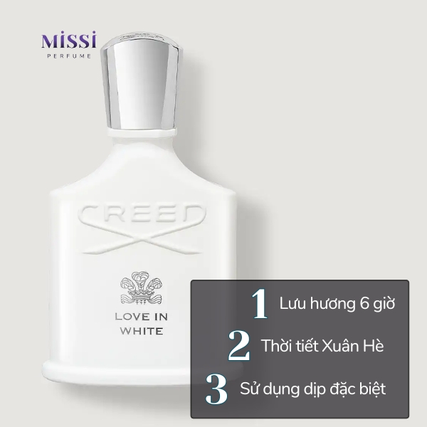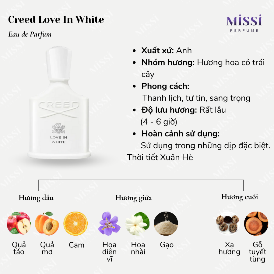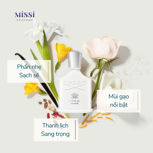 Creed Love In White là sự kết hợp của nhiều loài hoa, đặc biệt là có nốt mùi gạo. Tạo nên tông mùi phấn nhẹ, sạch sẽ, dễ chịu cùng độ lưu hương tốt đến 6 giờ và có thể lâu hơn khi nàng xịt thêm trên quần áo.