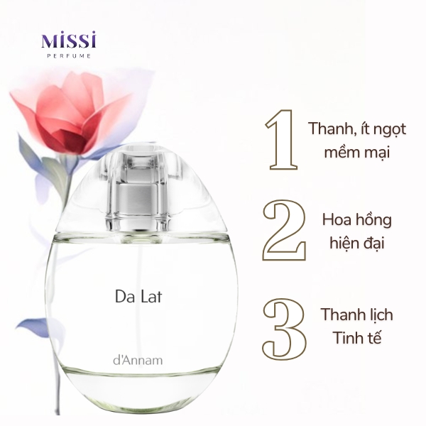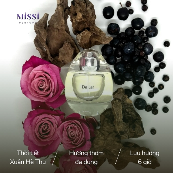 Nước hoa nữ D’Annam Da Lat cũng là mùi hương có tính ứng dụng cao, phù hợp với thời tiết Xuân Hè Thu. Hương thơm mang đến cảm giác nhẹ nhàng, dễ chịu nên có thể sử dụng trong những môi trường văn phòng chuyên nghiệp lẫn các dịp đặc biệt cần sự thu hút tinh tế.