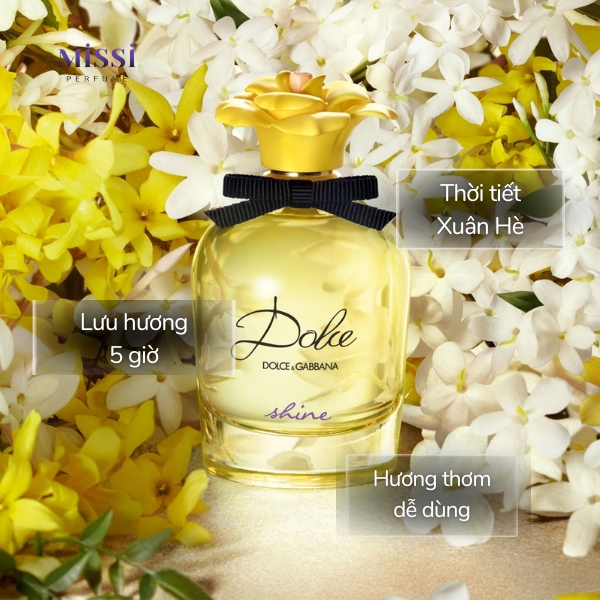Nước hoa nữ Dolce & Gabbana Dolce Shine là mùi hương của những ngày Xuân Hè. Em này cũng là dòng nước hoa đa dụng, an toàn, có thể sử dụng hằng ngày trong môi trường văn phòng và những buổi dạo phố, hẹn hò nhẹ nhàng.
