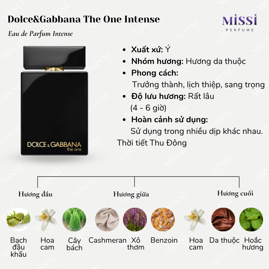 Cụ thể, Dolce&Gabbana The One Intense mở đầu chuỗi hương với nét mùi gia vị cay ấm của bạch đậu khấu, hoa cam và cây bách. Phần mở đầu này cũng mang đến cảm giác dày dặn và khiến mùi hương trở nên tối hơn. Sau khoảng 10 phút, hương thơm sẽ chuyển sang tông mùi mịn màng, sang trọng đến từ sự kết hợp của Cashmeran, hoa cam, Benzoin và xô thơm. Cuối cùng, sự xuất hiện của hoa cam, da thuộc, hoắc hương và Labdanum giúp mùi hương trở nên ấm áp, mềm mượt hơn.