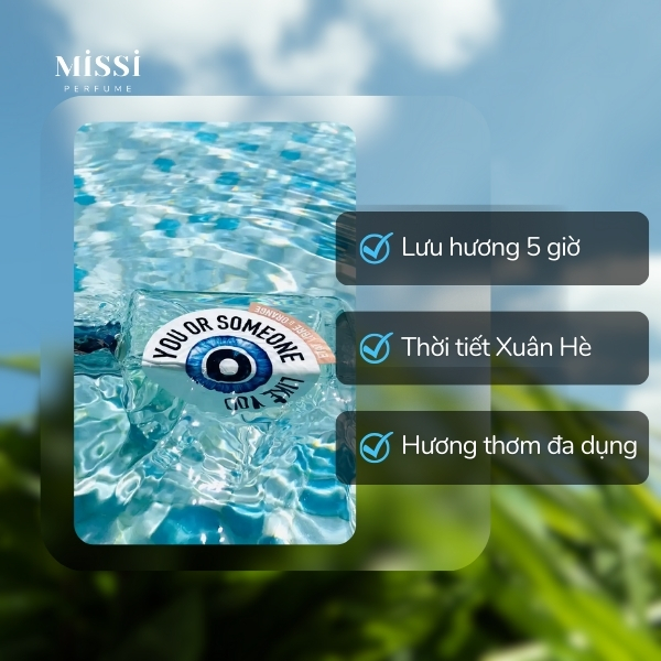 Nước hoa unisex Etat Libre d’Orange You or Someone Like You phát huy tốt nhất trong thời tiết Xuân Hè. Mùi hương này thích hợp sử dụng vào ban ngày khi đi làm, tập gym, du lịch, cafe với bạn bè,…