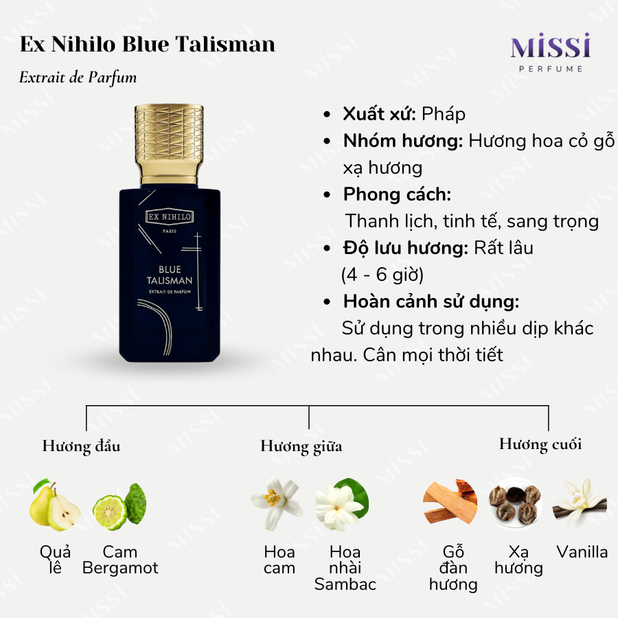 Cụ thể, Ex Nihilo Blue Talisman Extrait De Parfum mở đầu chuỗi hương bằng nốt mùi ngọt nhẹ, mọng nước từ quả lê và cam Bergamot. Sau khoảng 15 phút, tông mùi trái cây sẽ dịu xuống và lên hương thơm mềm mại, ngọt ngào từ hoa cam và hoa nhài Sambac. Hương thơm sau khi dry down sẽ biến chuyển sang tông mùi gỗ khô, ngọt nhẹ, ấm hậu từ sự kết hợp của gỗ hổ phách, Ambrofix, gỗ đàn hương, Vanilla và xạ hương.
