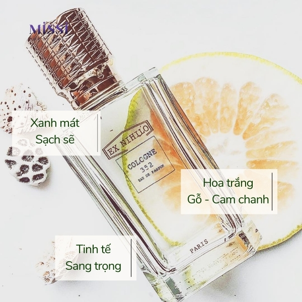 Ex Nihilo Paris Cologne 352 EDP gợi đến hình ảnh sang trọng, tinh tế, nhẹ nhàng cho người sử dụng. Mùi hương không quá phô trương, nổi bật mà gây chú ý một cách từ tốn, nhẹ nhàng mà đôi khi bạn bị cuốn vào lúc nào không hay.