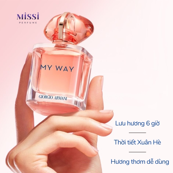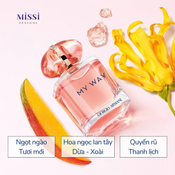 Giorgio Armani My Way Ylang EDP là mùi hương với chủ điểm là hoa ngọc lan tây và trái cây, tạo nên tông mùi ngọt ngào, tươi sáng. Em này cũng được đánh giá cao về hiệu năng bám tỏa với độ lưu hương lâu đến 6 giờ.