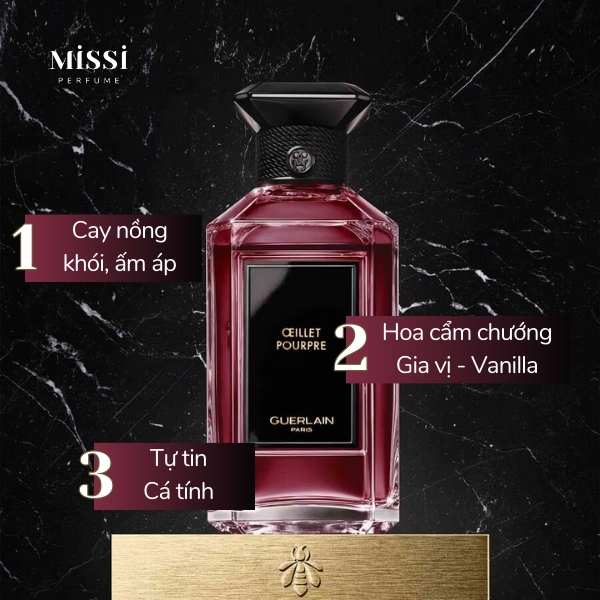Guerlain Oeillet Pourpre sở hữu tông mùi cay nồng, khói, ấm áp đầy thú vị. Em này cũng là kiểu mùi đa dụng, có thể linh hoạt sử dụng hằng ngày từ môi trường công sở cho đến những dịp đặc biệt cần sự nổi bật và thu hút.