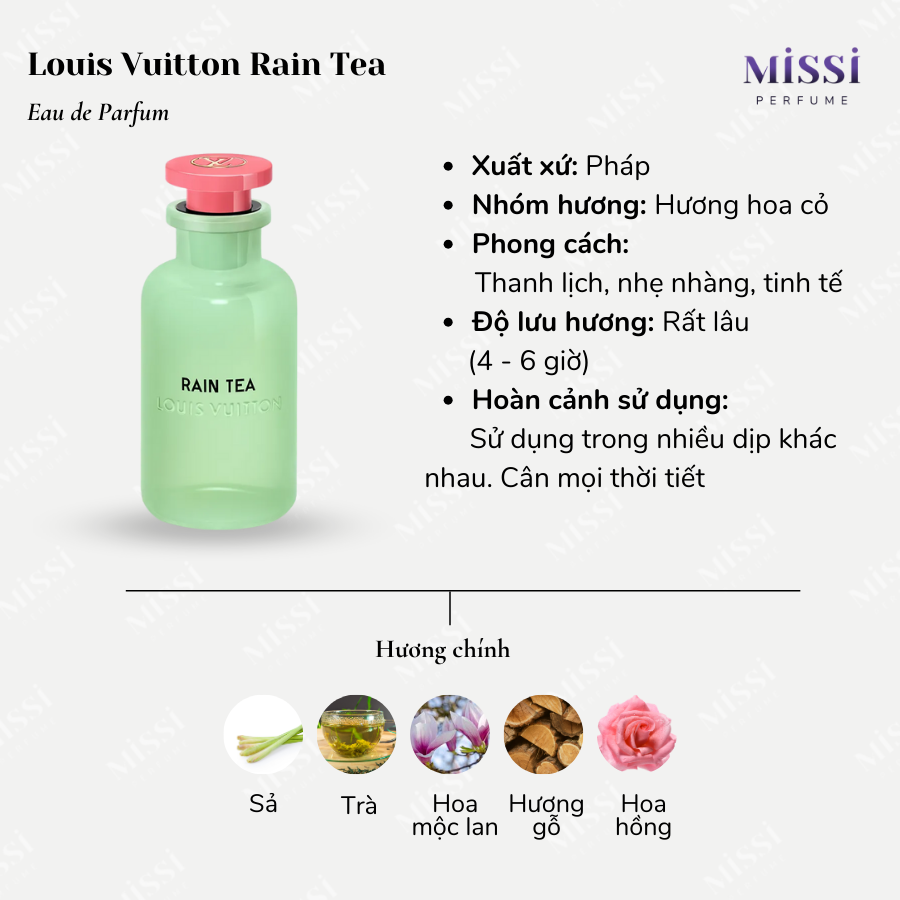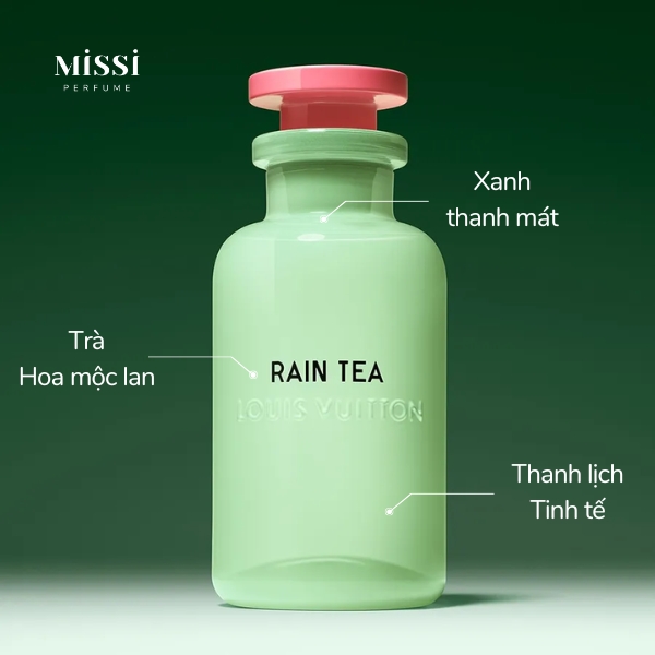 Với chủ điểm là trà và hoa mộc lan, Louis Vuitton Rain Tea EDP tạo nên nét mùi trà thanh mát, xanh dễ chịu và ấn tượng. Mùi hương phù hợp với thời tiết 4 mùa và dễ dàng sử dụng trong nhiều dịp khác nhau theo nhu cầu của người dùng.