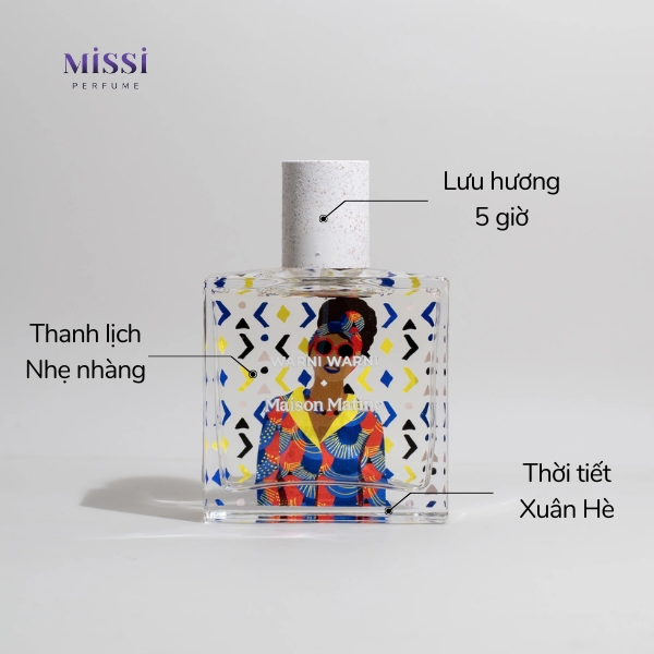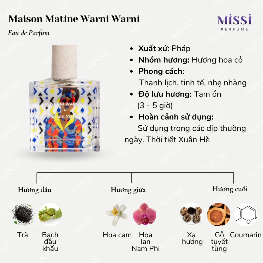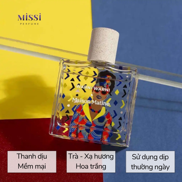Với chủ điểm là trà và hoa trắng, Maison Matine Warni Warni mang đến tông mùi thanh dịu, mềm mại, dễ dùng. Mùi hương lý tưởng để sử dụng trong thời tiết Xuân Hè, kể cả những ngày Hè oi ả nhất.
