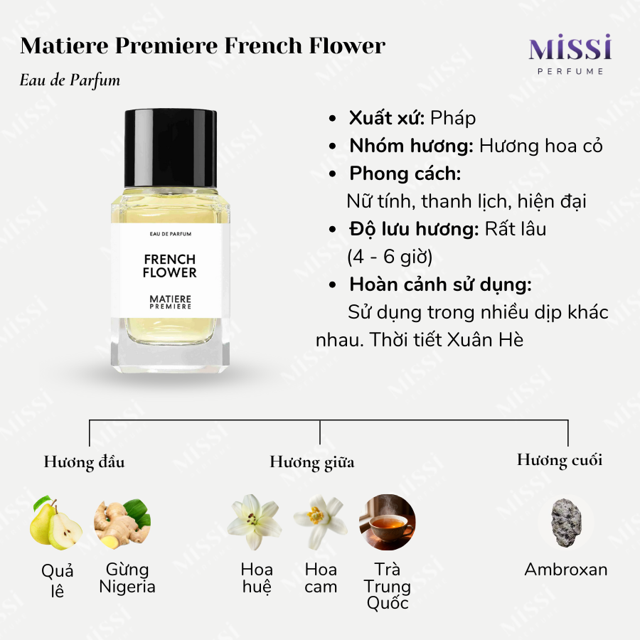 Hương thơm mở đầu với tông mùi tươi mát, mọng nước của quả lê kết hợp với gừng Nigeria cay nhẹ. Sau khoảng 15 phút, Matiere Premiere French Flower EDP sẽ chuyển sang tông mùi hoa huệ với tông mùi xanh mát, nhẹ nhàng kết hợp với hương thơm của hoa cam và trà Trung Quốc, tạo nên nét mùi mềm mại và cuốn hút hơn. Cuối cùng, sự xuất hiện của Ambroxan giúp hương thơm lưu lại tốt hơn và tạo cảm giác ấm áp, sâu lắng.