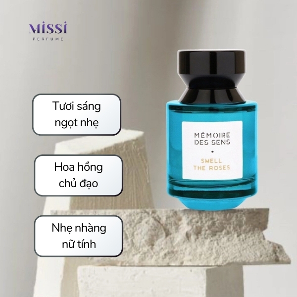 Mở đầu là nét mùi chua nhẹ, tươi mới từ lý chua đen và cam Bergamot được điểm xuyến thêm nét the cay nhẹ nhàng từ tiêu hồng. Hương thơm tươi mát lúc đầu sẽ dẫn bạn đến tầng hương giữa với sự kết hợp của hoa mẫu đơn, hoa hồng và hoa mộc lan. Nổi bật nhất là nét mùi hoa hồng tươi, sáng và ngọt nhẹ. Cuối cùng, Mémoire Des Sens Smell the Roses EDP khép lại trên lớp nền sạch sẽ, mềm mại của xạ hương và gỗ trắng.