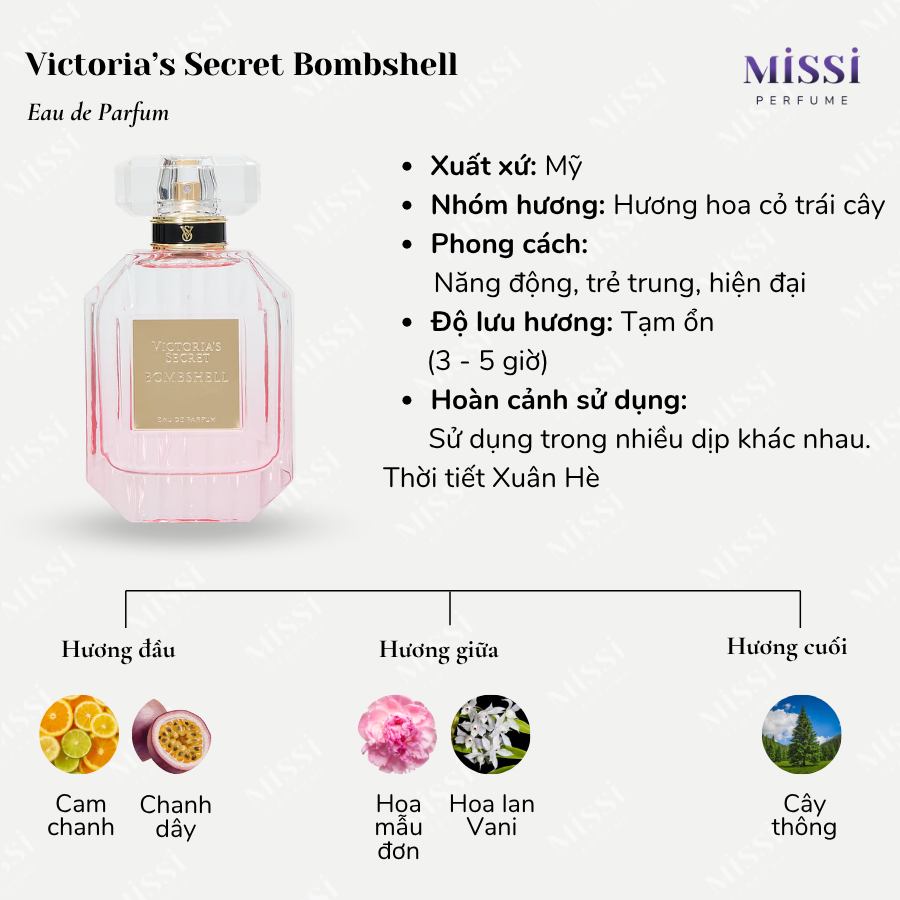 Cụ thể, ngay khi vừa xịt ra, bạn sẽ cảm nhận được mùi hương trái cây tươi sáng, mọng nước và cực kì dễ chịu đến từ quả chanh dây và cam chanh. Nối tiếp là tầng hương giữa với sự kết hợp của hoa mẫu đơn và hoa lan Vani, tạo nên tông mùi hoa cỏ thanh dịu, mềm mại trên da. Cuối cùng, Victoria Secret Bombshell lắng xuống trong nét mùi xanh ngát, tươi mới của cây thông.