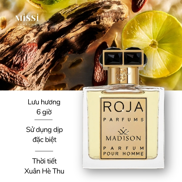 Có thể thấy, Roja Madison Pour Homme Parfum là mùi hương phức tạp được tạo nên từ rất nhiều thành phần. Hương thơm chủ đạo trong em này sẽ là nét mùi tươi, cay, ngọt nhẹ lôi cuốn. Đây thật sự là mùi hương không thể thiếu trong bộ sưu tập của những người chơi nước hoa lâu năm và đặc biệt với những bạn là tín đồ của nhà hương Roja.