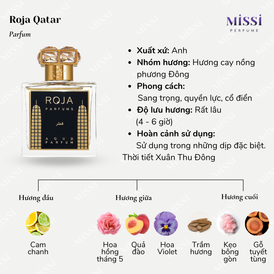 Roja Qatar Parfum mang đến tông mùi ngọt ấm, phấn, cay nhẹ từ rất nhiều nguyên liệu cao cấp. Hương thơm hướng đến người dùng theo đuổi phong cách sang trọng và quyền lực từ khoảng 27 tuổi trở lên.