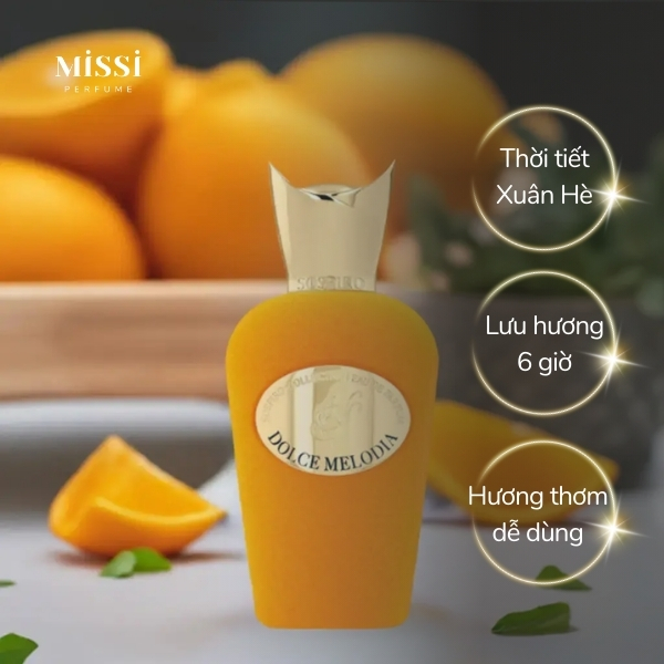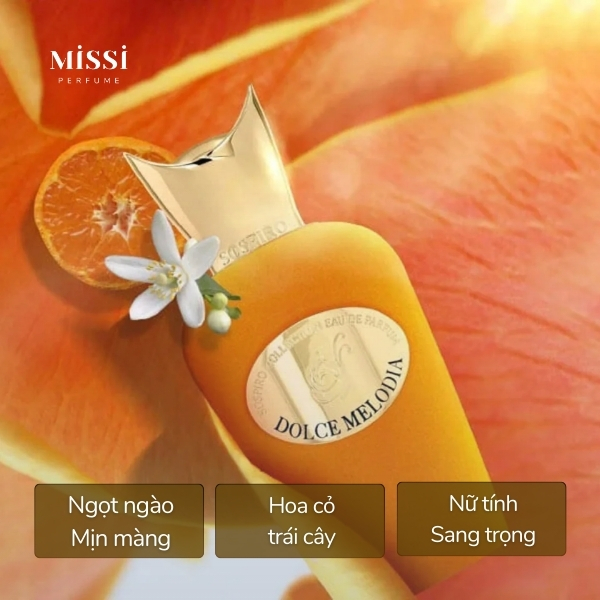Sospiro Dolce Melodia là mùi hương dành cho những cô nàng nữ tính và sang trọng. Em này mang đến tông mùi hoa cỏ trái cây ngọt ngào, mịn màng nịnh mũi và có khả năng thu hút mọi ánh nhìn mỗi khi nàng lướt qua.