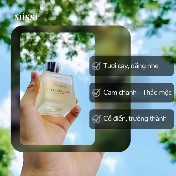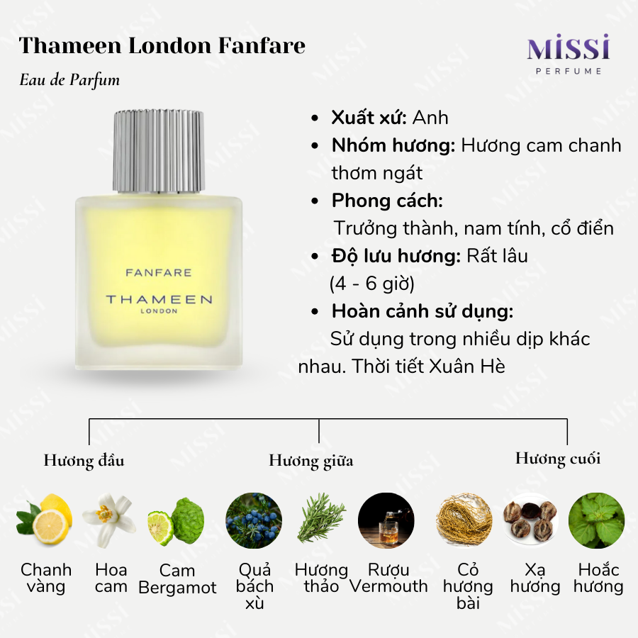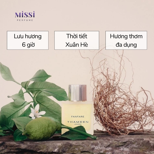 Cuối cùng, sự xuất hiện của cỏ hương bài, xạ hương và hoắc hương giúp cho hương thơm trở nên sâu lắng và lưu mùi tốt hơn trên da. Tổng thể, Thameen London Fanfare EDP là mùi hương theo hướng tươi cay, đắng nhẹ của cam chanh và thảo mộc. Các thành phần được kết hợp mượt mà, thú vị và hứa hẹn mang đến trải nghiệm hương thơm ấn tượng cho người dùng.