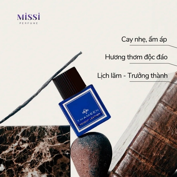 Khác với những chai nước hoa có tông mùi da thuộc theo hướng nồng gắt thường thấy, mùi hương da thuộc trong Thameen Regent Leather mang lại cảm giác rất mịn, mượt mà tựa như mùi của một chiếc áo da mới. Nhìn chung, hương thơm chủ đạo trong em này là nốt mùi cay nhẹ, ấm áp độc đáo. Chàng cũng dễ nhận được nhiều lời khen khi sử dụng mùi hương này.