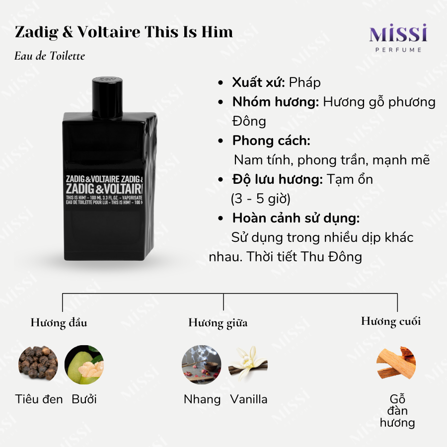 Nhìn chung, Zadig & Voltaire This Is Him là mùi hương theo hướng khói thoảng, kem mịn nịnh mũi. Độ ngọt trong em này rất nhẹ và tinh tế nên những bạn không thích nước hoa mùi ngọt vẫn có thể trải nghiệm qua em này.
