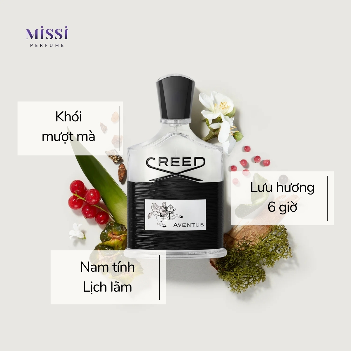 Creed Aventus được xem là vua của các dòng nước hoa nam và hầu như mọi tín đồ yêu hương đều biết đến em này. Điểm nổi bật trong em này chính là sự hòa quyện tinh tế của giữa vị chua của dứa, nét mùi nam tính từ gỗ, long diên hương kèm theo điểm nhấn của khói. Thay vì hình ảnh gai góc, bụi bặm thì Creed Aventus gợi đến một người đàn ông đàng hoàng, tử tế và lịch lãm. Do đó, mùi hương này rất được lòng phái nữ và chàng dễ dàng nhận được nhiều lời khen khi sử dụng em này.